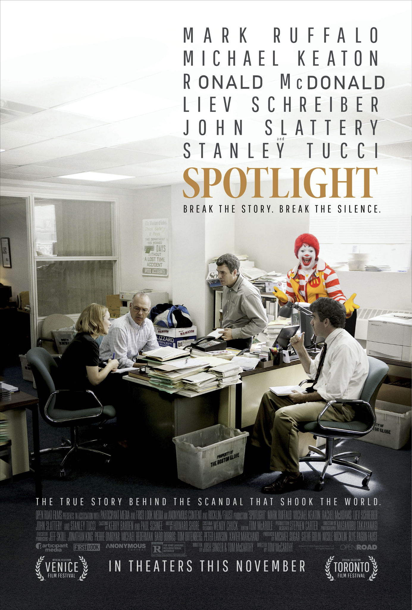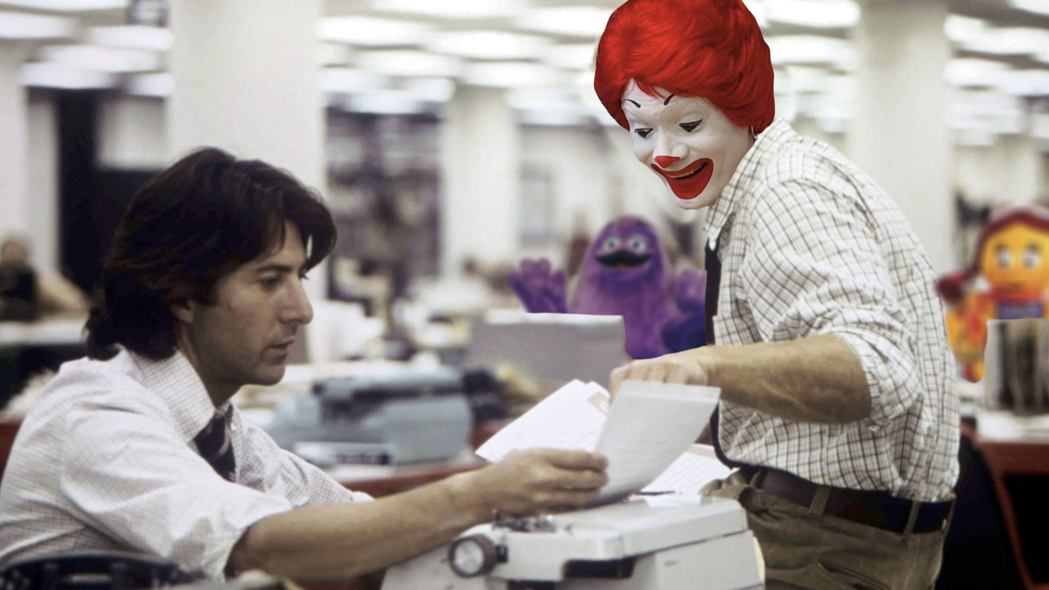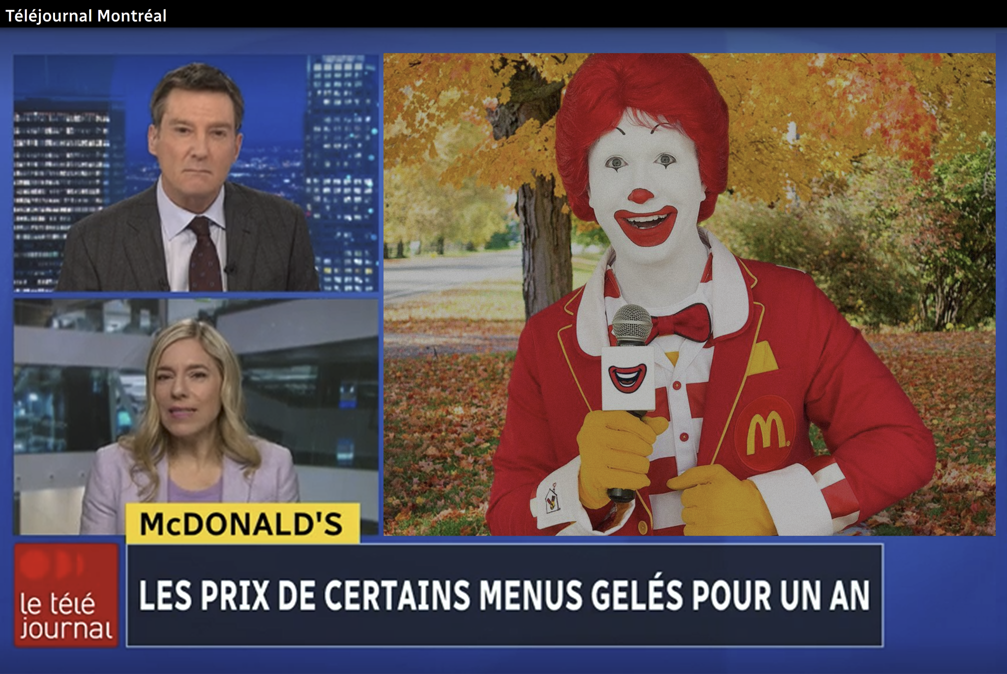 Michel se dirige à toute vitesse vers sa voiture. Il empoigne son téléphone cellulaire, une grosse brique grise avec lequel chaque appel coûte genre 5 piasses, et compose le numéro de son rédacteur en chef. «Lionel! Tu croiras pas ça. Je tiens de quoi de gros. Ça va brasser. C’est Ronald McDonald. Ronald! Il… IL GÈLE CERTAINS DE SES PRIX POUR UN AN!»
