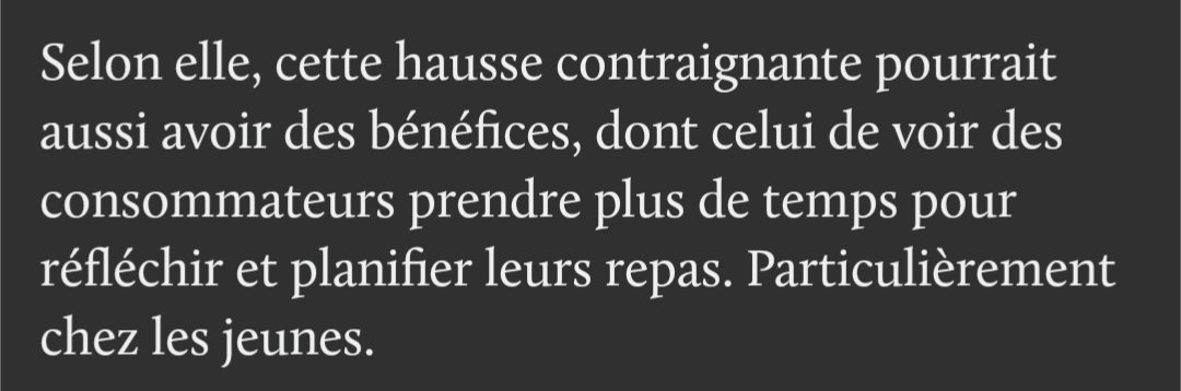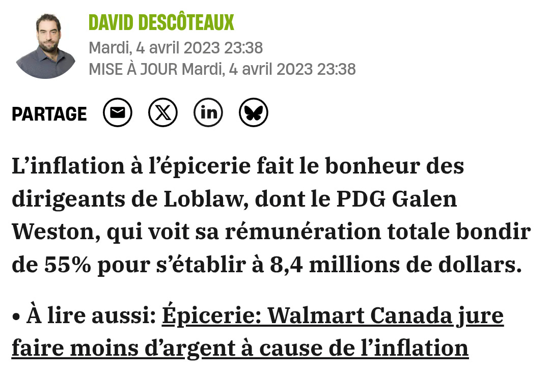 S’ensuit tout un dossier sur la précarité alimentaire, l’importance de soutenir notre agriculture locale, la concentration dans le domaine des épiceries et les salaires faramineux des PDG de grandes bannières, han?